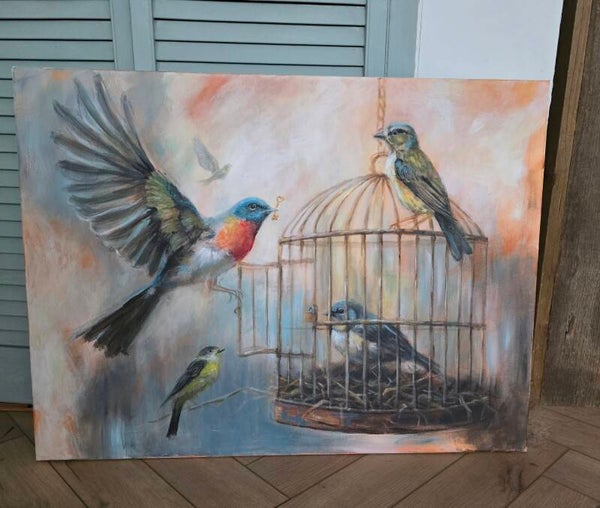 Met liefde opent Hij de deur van de kooi, waar de gevangen vogel, aarzelend naar buiten kijkt.